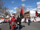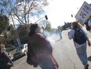 Америка 4 марта 2010 года предшествовавший 4 марта захват здания в кампусе Беркли Ночь перед стачкой прошла прекрасно. Мы искали по Беркли антибиотики - от ангины. Оказалось, что без рецепта нам ничего не продадут. Ангину пришлось отложить до Москвы. Не знаю, как я пробежала весь этот протест. Надеюсь, фото передают атмосферу. Плакатами о готовящейся стачке Калифорния была заклеена. Незадолго до стачки мы посетили тайное убежище, в котором анархисты рисовали баннеры для 4 марта. Я напомню, что основной смысл протеста заключается в требовании перераспределить деньги вопреки решению правительства. За счет уменьшения финансирования войн, тюрем, бюрократов, частных школ сократить плату за обучение, вернуть уволенных рабочих и повысить качество образования. Проводится также мысль, что образование - это право человека. 4 марта 2010 года с самого утра в кампусе Беркли были заблокированы ворота. Сцепившись локтями, студенты не пропускали никого. Желающие пройти могли перейти по овражку по камушкам. Над всем этим великолепием кружили вертолёты. По кампусу около одиннадцати стали ходить группы протестующих и срывать краны пожарной сигнализации - чтобы люди были вынуждены покидать здания. Многие учителя отменили свои классы. Многие не требовали отработок за пропущенное 4 марта. Утренний протест университета Санта Крус - там студенты перекрыли автомагистраль - по некоторым слухам закончился тем, что машины наехали на троих студентов - и одному сломали ногу. В сми подтверждения сему факту нет. Итак, студенты количеством 500 стояли на воротах, около 50 человек от профсоюзов стояли у дороги. Звукоусилители поставили на машину и в 12 начался митинг на проезжей части около Университета. Скапливающие транспорты протестующие пропускали. Автомобили и автобусы сигналили в тот момент, когда проезжали мимо баннеров - в поддержку. Затем, когда собралось несколько тысяч людей всех возрастов и национальностей, когда завершились все приготовления, протест двинулся в Окланд для единения с тамошними протестующими. Солнце припекало, но, вместе с тем, было холодно. Люди растянулись на километр. От полиции приходит негошиэйтор - переговорщик - выяснял, какие улицы для нас перекрыть. Люди действовали очень единодушно, слушались десятка командиров, скандировали сами ("Чей университет - наш университет", "Чьи улицы - наши улицы", "Кто учится - мы учимся", "Нет сокращениям", "Классовая война" ) и вообще проявляли удивительную активность. Очень свободный народ, не видавший притеснений от полиции. Я уже приводила слова некоторых калифорнийцев, что на их памяти таких массовых протестов не было. Такого же милицейского и государственного безумия, как в России, Америка не переживала. Поэтому протест был неустрашим и шел вперед. Первыми шли именно студенты, за ними - анархисты в черном, замотанные в тряпки и с черными флагами. А затем - остальные. Рассеять и остановить пытались несколько раз. К примеру, поставив на пути автобус с чернокожим водителем-женщиной. Женщина закрывала листком бумаги лицо, а активисты обошли автобус и продолжили движение. Под мостами кричали особенно оглушительно. Группа с огромным ковром-баннером "Вернуть обратно" помчалась вперед, вывесила его на рекламном щите, затем скинула вниз и потащила дальше. Активисты сами регулировали дорожное движение. Возгл