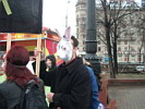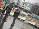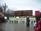 Фото с пикета в защиту зоозащитницы Лидии Поповой (15 апреля 2006 года) Текст центра защиты прав животных "Вита" 15 апреля в 12 часов в Новопушкинском сквере (напротив памятника Пушкину, через дорогу) прошла акция "Россия без жестокости!", посвященная протесту против бесправного положения животных в России. Организатор мероприятия - Центр защиты прав животных "Вита" при содействии других организаций по защите животных. Поводом для проведения пикета стал вопиющий случай, когда москвичка Лидия Попова, вставшая на защиту бездомных животных и пострадавшая за это от рук милиции и ловцов собак, теперь предстанет перед судом. 14 сентября жительница СВАО Лидия Попова стала свидетельницей противоправных действий со стороны Управы "Ростокино" и милиции. В нарушение Постановления Лужкова №819-ПП от 1.10.2002 г. глава управы "Ростокино" вызвал машину с ловцами, которые взялись отлавливать стерилизованных ранее (на государственные деньги) собак. Содействие ловцам оказывала милиция, также вызванная главой управы. В государственной службе отлова диких животных (ГУП СОДЖ) Л. Поповой подтвердили, что этот отлов незаконный, поскольку машину с ловцами они не высылали. Попытки Лидии Поповой встать на защиту закона, и отстоять собак успехом не увенчались. Животные отправились в неизвестном направлении, а Л. Поповой спустя некоторое время была вызвана в местное УВД, где ей сообщили, что против неё возбуждено уголовное дело по трём статьям УК РФ(!), включая "посягательство на жизнь сотрудников правоохранительного органа" (ст. 317УК РФ) и "применение насилия в отношении представителей власти" (ст.318 УК РФ). Суд над Лидией Поповой состоится 18 апреля по адресу: Протопопьевский переулок, д.19, стр.6, где Центр "Вита" также организует акцию протеста. На защиту Лидии Поповой, которой грозит 5 лет лишения свободы, встал адвокат Евгений Черноусов, известный по защите ветврачей "кетаминового дела". Этот вопиющий факт игнорирования местными властями и милицией Постановления Правительства Москвы, заменившего убийство бездомных животных программой стерилизации, далеко не единственный. Центр защиты прав животных "Вита" получает бесчисленное количество жалоб москвичей на продолжающиеся нелегальные отловы и убийство животных. К сожалению, префектуры, управы, и ДЕЗы заняли откровенно враждебную позицию по отношению к первому в России прогрессивному документу в защиту животных-компаньонов (собак и кошек). Так, например, СВАО сдал на утильзавод "Эколог" 98 тонн трупов животных за полгода, в то время как убийство животных в Москве запрещено! Однако, по сравнению со столицей, где общественность и пресса помогают выявлять случаи жестокого обращения с животными, в регионах дело обстоит гораздо хуже. Практика бесконечных отловов бездомных животных с их последующим убийством, имеющая место во всех городах России, лишь усугубляет ситуацию, способствуя размножению животных. Так, например, власти Самары и Ульяновска дошли до того, что призвали горожан убивать бездомных животных за вознаграждение. Ответственность за жестокость по отношению к сельскохозяйственным, пушным, подопытным животным не предусмотрена российским законодательством никак. Вся правовая база России по защите животных на сегодняшний день представлена одной-единственной 245 ст. УК РФ "о жестоком обращении с животными",
