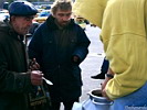 16.09.2007 Со слов Тора: киевляне сегодня готовили рис с овощным рагу (капуста, баклажаны и морковка). Готовили двумя группами сразу - это была как бы тренировка для второй группы. Все участники из нее были впервые на фнб. В следующий раз они уже будут делать всё самостоятельно. В акции принимало участие 8 активистов. Рассказ Узалга (Киев): сегодня приготовили рис с овощами + каркаде + хлеб. Мнения о том, сколько порций раздали, расходятся, но похоже, что около 70 - всё, что было. Потратили примерно 120 грн с учётом посуды; посуда и приправы остались на след раз. Раздали около 200 листовок. Менты нас гоняли и не давали людям доесть, заставляли выбросить тарелки сразу. Нас просили снять баннер ( - но почему? - тогошо. - но объясните?! - ТОГОШО!!) и чтобы люди, получив еду, оттуда с едой уходили. Количество еды: это загадка, мы помним примерно 50-60 человек, которым раздавали еду, но при этом риса было 60 литров и он весь ушёл, то есть каким-то чудом мы впихивали в тарелку больше литра))) это небесный промысел, не иначе. Готовили мы четыре с половиной часа, на готовке нас было семеро. Рабочая конфорка была одна. Еда: отдельно варили рис с приправами, отдельно тушили морковку-картошку-капусту-кабачки-зелень и всё смешали в пластмассовом бачке, выложив послойно. Одна из сегодняшних московских воскресных фнб-акций. Группа Magic hat (Тим, Женя, Любава). Готовили рисовую кашу с тыквой, морковью, луком и томатом (25 кг), еще было 7 буханок бородинского хлеба. На саму акцию приехала Даша, которая хочет начать инициативу в своём городе. Раздавали листовки. Был обнаружен один нервный пупс с двухглавым орлом и надписью "Россия" на рюкзаке, в закатанных брючках и с кривым лицом. После того, как я его сфотографировала, пупс скрылся. Мы ушли через 15 минут, когда докормили. Бездомные-москвичи ругались с бездомными-мигрантами:), мы как-то мирили их. Как всегда, Сережа просил передать Ка, чтобы она приехала. Из трех безногих инвалидов на Казани сейчас осталось двое - мужчина и женщина, третьего забрали в приемник. Детей также всех посадили за решетки спецприёмника. В общем, всё нормально, всё как всегда, с новой вакуумной бомбой вас, братья и сестры. Несомненно, вакуумная бомба больше всего сейчас нужна России. Особенно 4 миллионам российских бездомных. Успешные испытания в России сверхмощной вакуумной бомбы – новая сенсация, которая уже несколько дней будоражит умы западных военных, аналитиков и журналистов. Заместитель начальника генерального штаба России Александр Рукшин заявил: «Результаты испытаний созданного авиационного боеприпаса показали, что он по своей эффективности и возможностям соизмерим с ядерным боеприпасом»... Фото: Даша и Любава [1] [2]