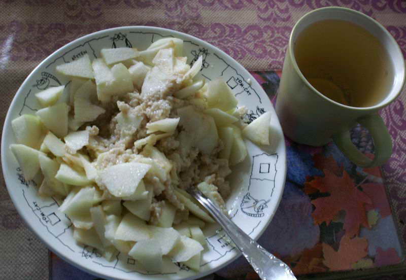 На столе: овсянка на воде, туда нарезано большое зеленое яблоко, и
