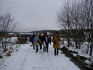Утром часть пиплов уехала, а остальные (Настя, Тёма (собственно, художник-монументалист), Pat3r, Маша, Риппи, Вова, Хлорка, Марина) по поводу того, что было немного снега, побежали лепить снежную бабу.